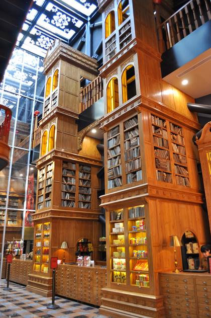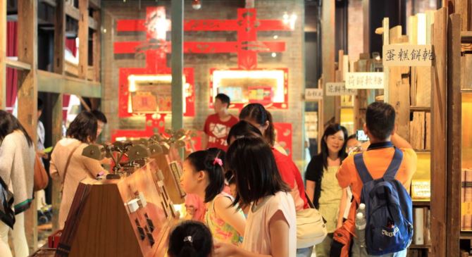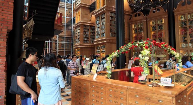 靠近臺中火車站的綠川旁,一棟由紅磚瓦構成的建築,是臺中以土鳳梨酥一戰成名的「日出」蛋糕團隊買下了宮原眼科的舊址。宮原眼科外部的紅磚牆、舊牌樓被完整保留下來,打造成富有懷舊風情的紅磚木頂式騎樓,走進店內,仿造復古挑高圖書館的裝飾,創造出新舊時代的魔幻空間,店中央一座無法被使用的古井,則被重新打造成現代風的圓型玻璃募款箱,可見設計之巧思。