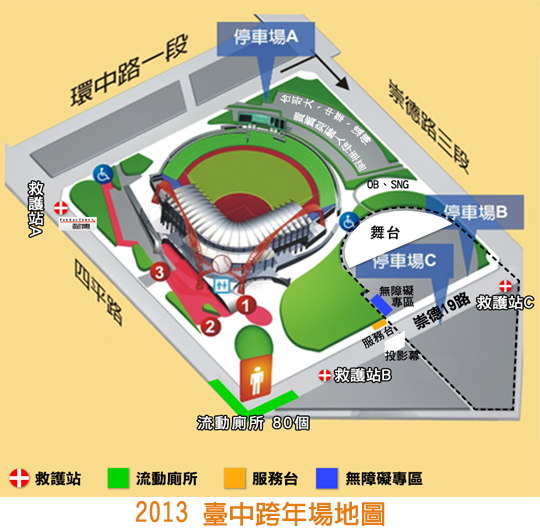 地點:台中市洲際棒球場旁停車場(台中市北屯區四民里崇德路三段835號,環中路與崇德路交叉口)、(谷關、新市政中心廣場同步連線倒數)