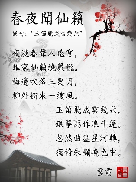 春夜聞仙籟 (嵌句:“玉笛飛成雲幾朵”)