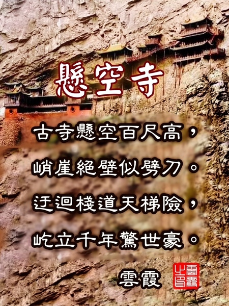 古寺懸空百尺高,峭崖絕壁似劈刀。