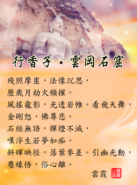 風搖龕影,光透岩帷。看飛天舞,金剛怒,佛尊悲。