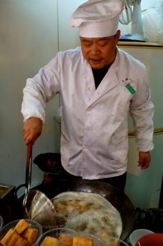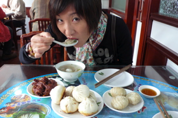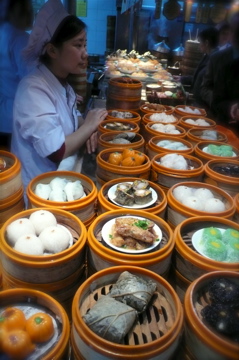 到上海的第二天,H一改平日赖床的习惯,爽快地起了个大早,我们兴冲冲地来到了城隍庙。城隍庙是上海的旅游重地,近年来大修特修,尽管九曲桥,湖心亭依然如古,但周围小店的门面都被修的比卡比卡地铮亮,除了张小泉的剪刀店,檀香梳子店等传统店仍在,还增添了许多卖手机挂件,迎和老外胃口的t-shirt衫这样的时髦小店。尽管时间还不到十点半,这里早已是人声鼎沸了。随着前胸贴后背的人潮我们来到了南翔小笼饱店,只见长长的队伍已排出十几米远了,看来比我们谗的人真不少呢。我们“望队兴叹”,苦于时间太紧, 抱着有吃总比没吃好的阿Q精神, 决定到隔壁的“准”南翔小笼店过瘾。当我们在一张油汲汲的方桌边刚坐下,服务生就递上了菜谱,我们看着我们又熟悉又久违了的小吃,食欲大振,痛快地点了我们谗了多年的上海经典小吃,小笼饱,小馄饨,香螺,生煎,萝卜丝饼。当我们万分满足的跨出饭店不久,小街的拐角口飘来阵阵臭豆腐香味,我无法相信刚才还吃得撑不起腰的G,此时又端着一盆臭豆腐站在街上大嚼起来,他边吃边对我说,太香了。等H 三口二口地把臭豆腐吃完,我们来到了城隍庙前的广场,没想到这里的吃劲更足,不仅有上海周边江南的小吃,如姑苏梅花糕,宁波千层饼,还有外地的特产,如成都三大炮,北京冰糖葫芦,天津麻花,烤羊肉,烤八爪鱼等这些五花八门的另类小吃,它们令我们大开眼界,为之垂涎三尺。苦与我们的肚子都早已撑到了极限,只好一个小吃摊看到另一个小吃摊,大饱一下眼福吧。这时,时间已过了中午,秋天的太阳不烈不刺,秋风夹着各种各样小吃的香气,在城隍庙的上空飘荡着,我们的周围是拥挤的人群,人们的吃像百态,有的拿着竹签串着成都三大炮,有的仰着头添着粘粘的龙须糖,有的用吸管吸着汤饱,每个人都是一副既狼狈又不在乎的满足样子,我想他们中间一定有一大半是象我们这样的,想从记忆中的小吃来寻找旧时情感的人,小吃香甜在嘴里,千丝万缕的往事却一起涌上心头,小小的小吃在我们的人生中尽然有着如此重的地位,它是我们无论漂泊多远的游子,回乡寻根的诱惑力,它是我们在思念我们远方故里时的味道。童年的往事,左邻右舍的乡情,小吃里的传说,和幼小心灵对世态炎凉变千的观察,似乎都在咬开一样小吃的瞬间展现在我们的脑海里,我找不出我们的生活里还有什么比这些小吃更能帮我们怀旧的。这时H从人群中转身来找我,他瞧着我仍对着一堆小吃发愣的样子,便问,“还没吃够吗?”我突然想起了什么,对他说,“天哪,我们还没有吃桂花酒酿汤团呢!”“那怎么行,那可是你的最爱啊”我说“是啊,肚子再撑,我也要吃了酒酿汤圆才能安心回家呀。”“没问题,我愿意陪吃到底”,H笑着回答道。
