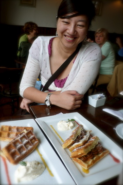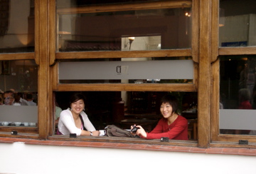 推门走进街角的这家咖啡馆,里面木凳,木桌,柔柔的壁灯呼应着从高高的木窗里斜撒进来的夕阳,几个客人零散地坐着,轻松地喝着咖啡聊着天。待我们在靠窗的桌子边坐下,一位瘦瘦高高的服务生递给我们二份菜单,面对着生疏的西班牙语,我们无从点起,好在咖啡(Coffee, Café)似乎是国际通用语言,不管在哪里一开口即灵,可是点心呢?我们经过一番努力,连猜带蒙地点了一道点心拉倒。不一会儿,咖啡来了,接着我们的胡乱点的点心也来了,一看盘子,我们惊喜不已,是化麸饼,鲜奶油加鲜草莓,点的不错。我和青青迫不及待地抢先举起叉子投向甜点,当我们把化麸饼加鲜奶油放入嘴中,我们不约而同地瞪大眼冲着对方猛点头,“真好吃”我们一起叫了起来,远远这时也抿了一下咖啡,说“不错”。我端起咖啡喝了一口,这杯咖啡不仅咖啡味香,而且有一种原始的香醇,口感也滋润过美国的星巴克,我忙对远远说,“这怎么叫不错,这咖啡简直是太棒了”。一会功夫,我们几个都把咖啡杯和化麸盘子来了个底朝天,窗外的音乐这时也停了,人群一会也不见了,我们也意犹未尽地离开了咖啡馆。