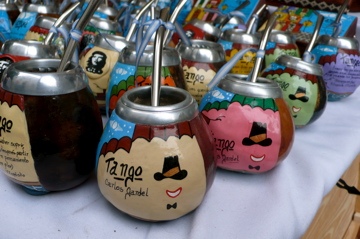 走出咖啡馆,向前不远就到街底了,左边是一字排开的露天市场的摊位,此时绝大多数都是空的,只有二三家比较巴结做生意的摊主还摊着东西再卖,我们好奇的走上前张望着。它们卖的东西花样可多了,一家的桌子上摊着几排比拳头大一点,如葫芦似的罐子,罐口镶着铝边,里面插着根铝做的吸管,不知是派什么用的(在后来的几天旅游里,我们才知道那是阿根廷人喝一种当地的茶的工具叫Mate),罐子的身上都画着彩图和写着“Tango”字样,另外一个摊子上高高挂着五颜六色的围裙,走近一看,它们上面画着各种各样跳Tango(探戈)舞的卡通。再往前,那儿有一个孤零零的摊子,摊主人低着头忙着收摊,他挂在墙上卖的也是跳Tango舞的漫画。我无意中又发现街的墙上贴了不少教授Tango的广告,我们一下子似乎被Tango笼罩了,尽管那时我还不知道San Telmo街是Tango的发源地之一,但我已可以感觉这里与Tango一定有着重要的关系。果然不远处的一个小公园里响起了Tango舞曲,我们三步并二步地赶去那里,看看是否还能轧上最后的闹忙。公园不大,一块马赛克的空地上铺着旧地毯,四周环抱着我先前喜欢的那种树,树下围坐着一群人,男男女女,老老少少都有,他们有的象当地人,有的象旅游客,随着Tango铿锵有力的节奏,此时已有四五对在跳着呢,他们跳的并不熟练,但个个神情投入,举目望去,看的人也随着音乐点着头摇摆着。夕阳渐渐地下沉了,San Telmo街已从白天的叫卖,喧闹中平静了下来,咖啡馆里的桌上点起了蜡烛,铺上了白桌布将开始服务晚餐了,对星期天的欢乐还不想马上收心的人,对那些买了一堆子与Tango有关的旅游纪念品的游客,此时可以在这个小公园里,小憩一下,然后亲身上阵,过过踏着Tango的节拍,甩头甩脚的瘾,也许那位抱了一天假舞伴的街头艺人,此时幸运的他也找到了一位真许正的“她”,正温馨地搂着,庆幸他们的相逢 。San Telmo街魅力无穷,难怪它被列为Buenos Aries旅游必到点之一呢。