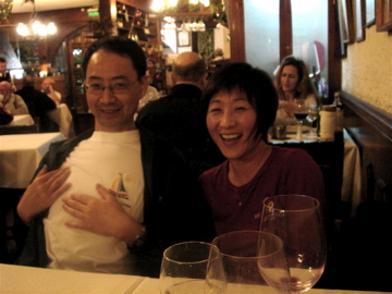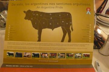 我们的waiter是一位长的同牛排一样结实的中年人,他客气地同我们打着招呼,待我们坐定,他给我们每人递上一本印有彩色图片象杂志一样的菜谱和一本象字典那样厚的酒谱。翻开菜谱,第一页是一头牛的横面图,上面象医学解剖书一样在牛的身上划分区域,并且标上由A到O十五个部位,然后对号入座,在下面注明每个牛部位的名称。接下去的几页才是牛排菜的菜谱。哈哈!我们几个顿时忙碌了起来,一边看菜谱一边对照牛的解剖图,看自己点的菜是吃牛的哪一部位。这不仅对我,对青青,光光这些食肉族也是一次大开眼界。经过一番努力大家总算搞定各自的主餐。