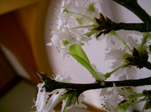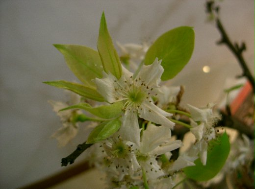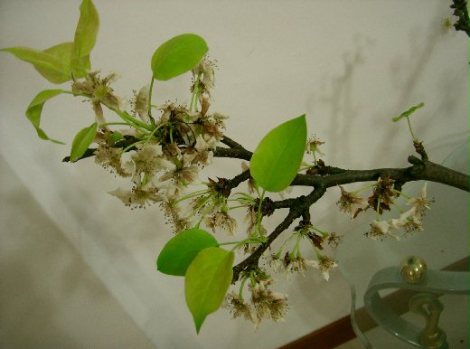 插了一個多星期,梨花紛紛開始枯萎、凋謝,但在或褐或白的花色當中,綠色的芽也悄悄冒出來,靜靜地、慢慢地舒展開來。