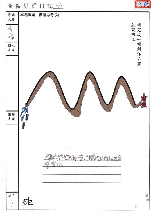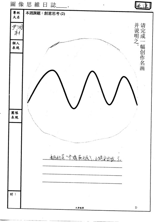 這又是一個實際在我們課堂上發生的作業,真是一個令人覺得恐怖的現象。原本應該是一群沒有框框限制的孩子,但是當老師要求他們把框框拆掉時,孩子們卻連拆掉的能力都沒有!老師明明要求他們不要畫山,但沒有受過思考訓練的孩子,看到這條像山的黑線,竟然沒有一個可以跳出這條線的框框,所以每一個孩子畫的幾乎都是山。