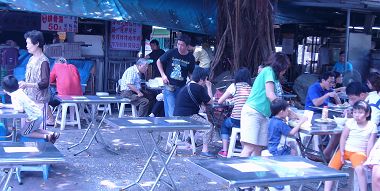 食客被這樣惡整的原因是,有些攤家可能自己提供桌面,還打上商號名稱,如果光顧甲攤,使用甲攤的桌面,但卻點了一些乙攤的食物,食後的殘局就變成三不管,乙攤只會把碗收走,其餘不理。好啦,終於領到食物打算開動,沒想到左邊桌子的客人突然爆出三字經,芭比一看,這位仁兄一隻腳還踩在板凳上,而這句三字經往往只是開場白,一頓飯的時間,芭比怕不要聽上數十句各式各樣的三字經,以及各種大聲粗魯的回應。囫圇填飽肚皮,悻悻然準備離去,突然咚地一聲,又有酒客翻倒在地上。