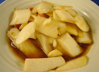 芭比和老公去南京旅行了幾天,第一餐就不小心發現有「涼拌蘿蔔皮」這道菜,話說這道菜也是芭比媽常做的,芭比媽做的是用味噌醃漬蘿蔔皮,每當芭比回家,便倒一些給芭比解饞,芭比已經愛不釋口了,沒想到江浙地區的涼拌蘿蔔皮,滋味是那麼美妙,後來的好幾餐,芭比一拿起餐牌,都會先檢查有無「涼拌蘿蔔皮」,其結果必然是有的,而每次也都會點上一份,逐漸揣摩到製作的重點,改天回家,換芭比做給老媽嚐嚐鮮才行。
