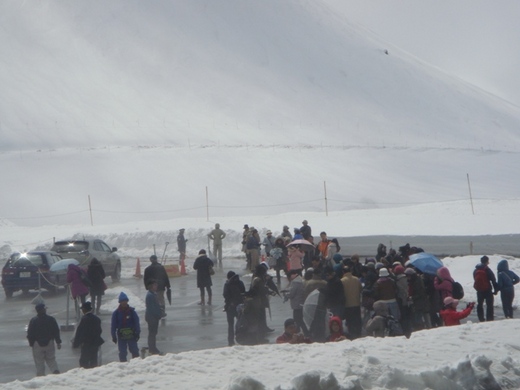 毎秒10t水以上の量が水煙をあげて放水されると水しぶきが舞