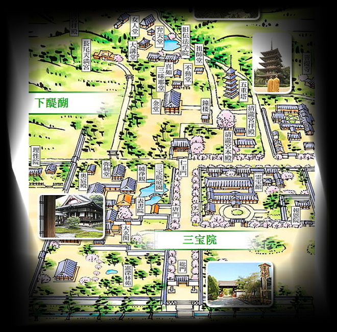 分別為左側的三寶院與憲深林苑、北邊仁王門之後的伽藍... 與 右側的靈寶館 ~
