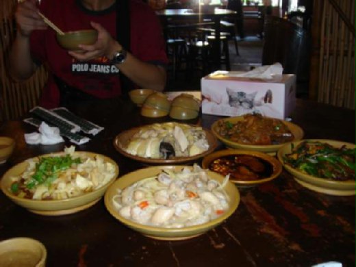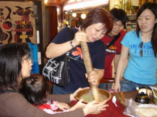 我們的午餐一共有八菜一湯,全都是大家熟知的客家名菜,像是高麗菜封、梅乾菜湯、蔥爆鹹豬肉、薑絲炒大腸、蒜苗魷魚、筍乾、白斬雞,再加上炒青菜、炒豆腐和地瓜飯,滿桌美味的佳餚真的吃得很過癮。尤其我們這一桌剛好分配到5個大人+一個3歲的小朋友,一大桌的菜真是怎麼吃都吃不完耶!而且一般說來,客家菜比較重口味,酸酸鹹鹹的,所以非常下飯,滿桌子的菜讓踢翻你食指大動,忍不住吃了好多菜。