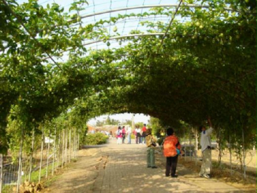 不過由於踢翻你沒有辦法騎腳踏車,所以我和媽咪就選擇搭11號公車去逛囉!一進入園區,迎接我們的是一條由百香果搭成的綠色隧道,走進百香果隧道裡的感覺真是新奇呢!一顆顆的綠色百香果非常可愛,讓大家忍不住抬頭研究了老半天,結論是這種百香果應該不能吃,純粹觀賞用。
