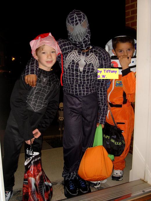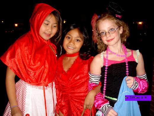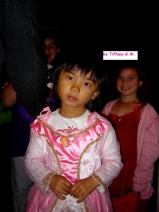 當然剩下我留守在家,就客串起女主人,隨時應門,幫忙分發糖果、口香糖等零嘴,這臨時演員的任務挺有趣的,既然拿人的手軟,每位小客人都答應讓我拍下他們五花八門的戲服,諸如科幻漫畫裡的超人、配上現代科技栽培的太空人、老虎、牛仔、水電工、長出薄翼翅膀的小仙女、以及穿大紅印度風長袍的俏妞等等。仔細瞧,這些孩童都有備而來,手上拎的糖果袋可不小,因為起碼會到幾十戶人家要糖,有些袋子顯然是家庭手工出產的,比如做成像南瓜的模樣;有的用現成的塑膠手提工具箱; 有位頭戴巫婆大黑帽的大姐姐最誇張,居然端出是別人袋子兩三倍大的登山背包,鐵定是名糖果迷。最底下的圖是表弟的女兒Emily裝扮成小公主,回到家留下的倩影。