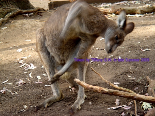 澳洲袋鼠似乎人來瘋,一點也不怯場怕生,短短十來分鐘搔首弄姿,平均每半分鐘換斜躺、趴坐、彎腰、起立等各種姿勢,下圖搔癢的動作真像小丑在耍寶。
