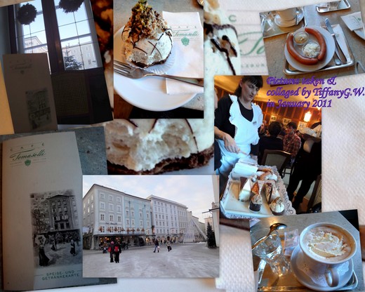 飛機上喝速食咖啡,自然提不起細品慢嚐的興致。 坐進奧地利最古老的維也納式咖啡屋則不然。德國知己T開車帶我往莫尼黑的途中,提議可順道一遊Salzburg Cathedral著名大教堂,見他在教堂入門內雕像盆領聖水,輕點額頭和胸前,隨之虔誠默禱的肅穆模樣,很難想像他是家人戲言的〔電視 電子遊戲兒童〕,T極力否認此綽號,說這樣會讓人誤會他很沒文化水平。的確,至少T選餐廳展現品味不俗,談美食起源也如數家珍,連常人誤會為法式或瑞士點心的〔〕(格主德法文程度極淺,此名稱待查,再補記),他都能指出系出德國何地。尤其走出大教堂,他帶路穿過巷弄,來到三百年前起迄今文藝人墨客絡繹不絕的CAFE TOMASELLi 湯瑪喜莉咖啡屋,更讓我驚喜莫名,感謝T願意舊地重遊,分享歷史古都之佳旅。