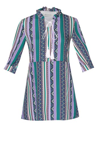 KLEEaisons 民族風印花直筒連身裙,滿版異域情調的民族風印花,荷葉飾衣領有流蘇繫帶設計,讓你輕鬆度過愜意悠閒的夏季時光。- 人造絲- 荷葉領和繫帶設計- 五分袖- 寬鬆裁剪- 有內襯