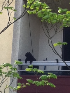 頭一抬 好個前兩腳晾掛在二樓陽台欄杆上的大黑貓