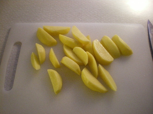 把馬鈴薯削了皮後切成瓣。(懶得削的話,不削帶皮也可以)臺灣賣的馬鈴薯個頭都很大﹐可能要切成瓣會變得很長﹐那就先把馬鈴薯腰斬後再切﹐不然切成比麥當勞薯條大兩三倍的粗細的條狀也成。