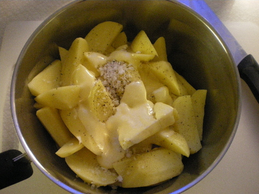 一湯匙的牛油或植物奶油﹐---沒有的話﹐豬油也成吧﹐雖然我沒用過豬油。不建議用橄欖油或葵花油這種液態油。覺得用有點固狀的油效果比較好。但是不管奶油或豬油﹐一定要溶化過才加到馬鈴薯裡去喔。
