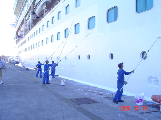 上圖 因為船永遠都在工作中,所以船的維修也都是在海上進行, 這天天氣好, 所以就來油漆一下船身, 保養一下囉.