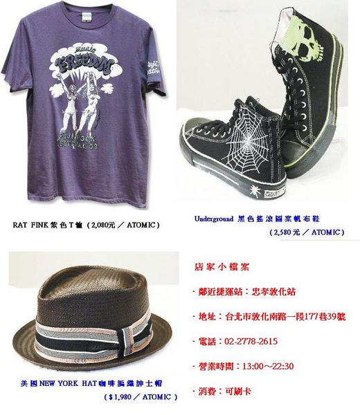 ATOMIC的商品包括服裝、帽子、包包、飾品、鞋子、太陽眼鏡與玩具收藏,看似小小的一家店其實還有分身,店旁的走廊有拉門分區陳列,記得叫老闆打開門讓你挖寶。