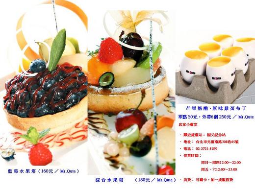 這個月才剛開幕的Mr.Qute,水果塔分量十足,搭配不同口味的慕絲、蛋糕和水果,光看都讓人流口水;下個月還將推出芒果奶酪和原味雞蛋布丁。