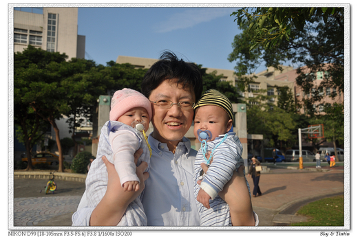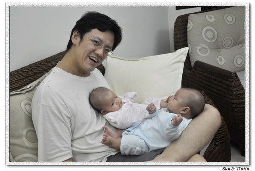 傻眼過後,也是迎接了兩個可愛小寶貝...我常笑說我們是另類的單親家庭...因為兩個人要顧兩隻...通常,是爸爸抱弟弟,媽媽抱妹妹...(因為弟弟的噸位較重,哈哈...),老爺除了親餵這件事沒做過之外,舉凡泡奶、餵奶、餵食物、洗澡、處理便便、陪玩耍....等等...應該沒有漏掉過任何一件事了~~不止如此...家事他也不能少做呀...洗碗、倒垃圾、吸地、擦地....