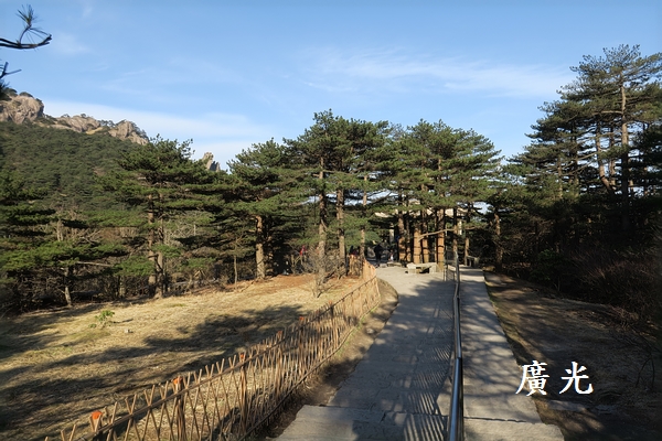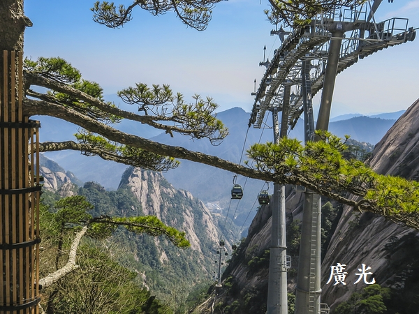 105.0328日上午參觀了木坑竹海,午餐之後從屯溪轉往黃山,遊覽車先在黃山大門的管理處停車,轉搭園區的巴士到玉屏纜車站,因為已經是下午了所以遊客不多,在車上隨山勢千迴百轉之間,只覺得道路狹窄,但是沿途路況良好風景如畫,尤其是修竹、古松與春天的繁花將整條路妝點得美麗極了。