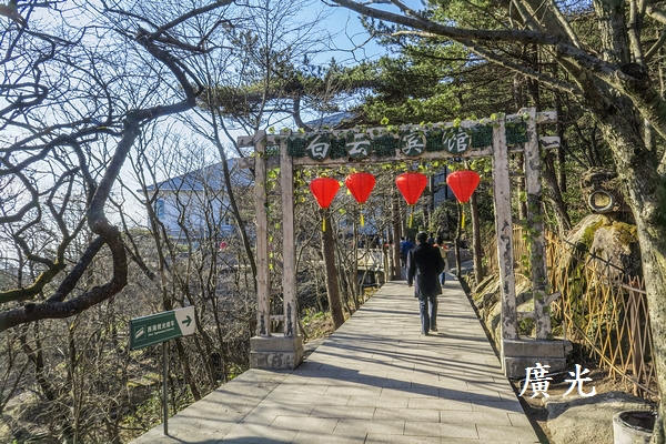 看完迎客松後走回頭路,今天的住宿旅館位在黃山前山與後山交界的「白雲賓館」,從玉屏纜車站過去還有好大的一段路程要走,對我這一團年齡幾乎都在五字頭以上的團員而言,無疑的是一項嚴酷的考驗。