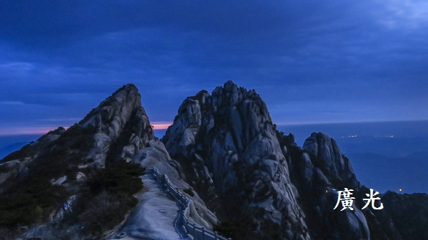 清晨0500時從白雲賓館出發,不到15分鐘就到達鰲魚峰的觀景平台,天還是黑的,平台旁只有一位比我還早到的年輕人,窩在岩縫裡躲避強勁的風勢。北邊的「光明頂」山頭上燈火通明,一條燈龍「之」字形爬上山頂,顯然早起欣賞日出的人不少。