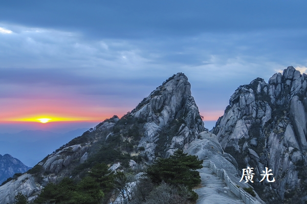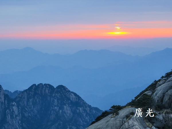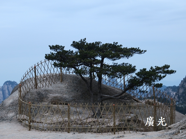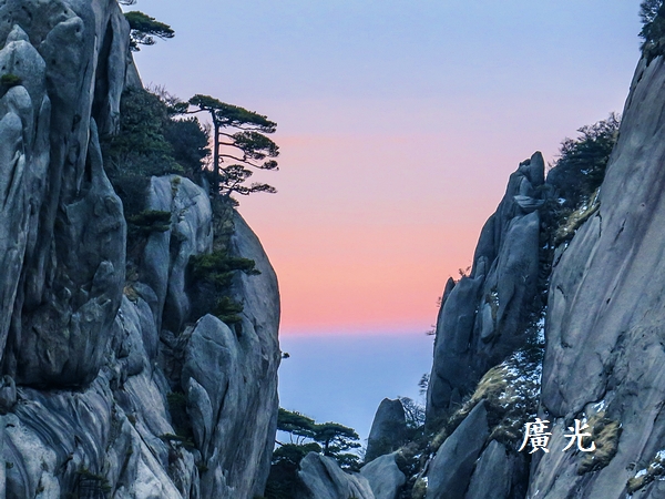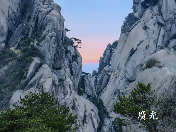 黃山之所以有名,我認為:一在於其山勢之險峻、二在其雲海之夢幻、三就在於其「松樹之奇」。有名的黃山迎客松只是代表作之一,其他絕美的、長在不可思議位置上的奇松,還有待有心人去發掘、欣賞。眼前這一棵長在兩山之間的奇松,配合著周遭的山勢、日出的雲彩,顯現出夢幻般的美景,讓人遐思、神往。