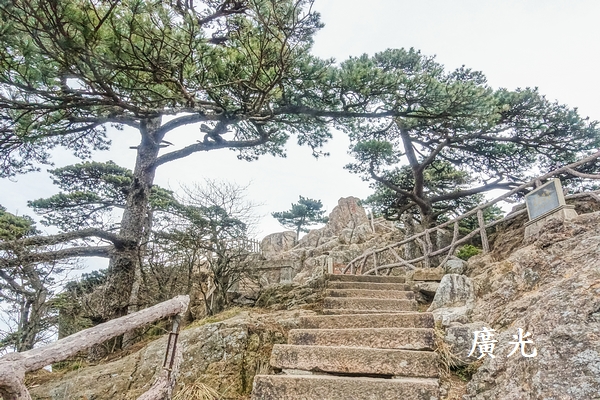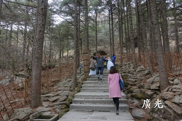 回到白雲賓館後開始爬階梯道上光明頂,步道兩旁的黃山松因為生長在避風的山谷中,棵棵高大筆直,與剛才山頂岩石縫中匍匐的黃山松簡直不像是同一樹種,讓人見識到環境對植物生長的影響如此之大。
