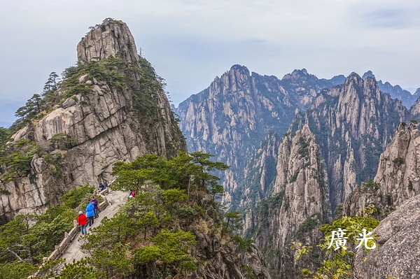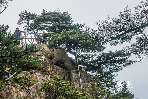 黃山第二天上午在白雲賓館吃完早餐,將較重的行李交給挑夫之後,第一站我們輕裝從賓館往返西海景區的「西海瑤臺」,沿途都是黃山最具代表性的山色,挺拔的黃色巨石上,幾株黃山松點綴其上。