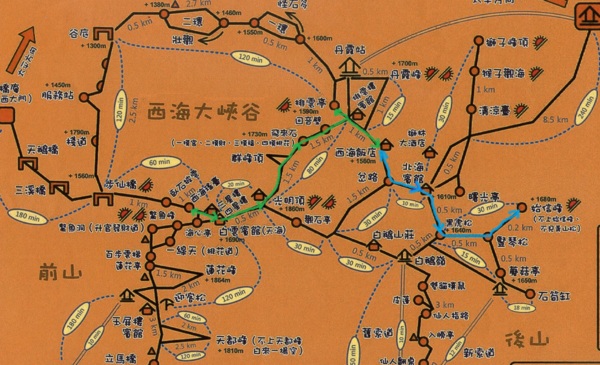 上圖綠色路線是我們黃山第二天上午的行程,藍色路線是我們下午的實際行程。