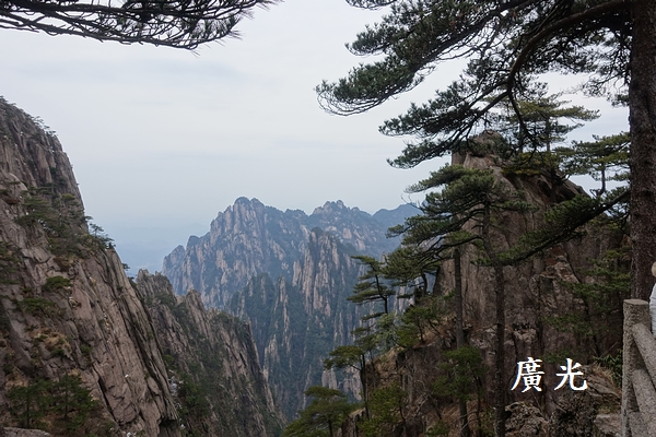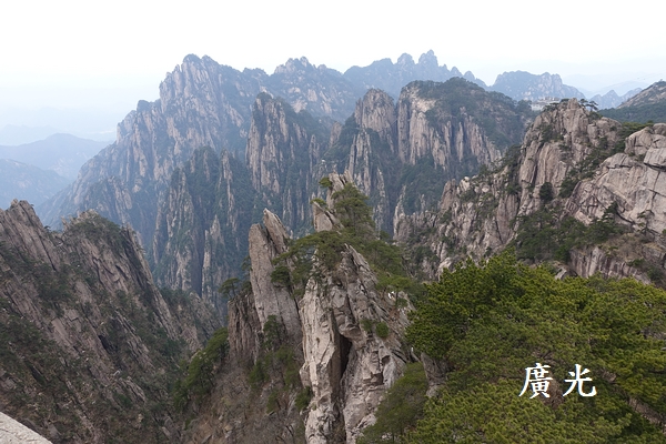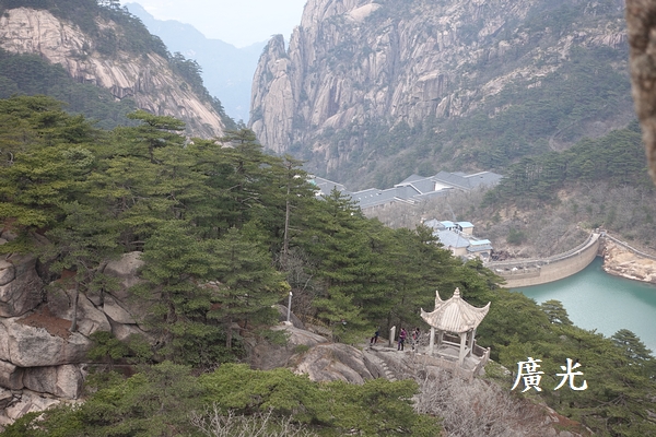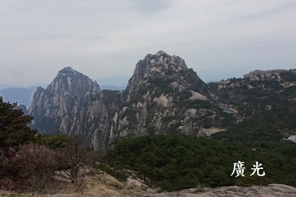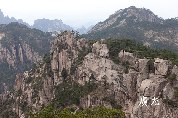 光明頂看似遙遠,但是認真地走來卻覺得輕鬆 ,從山頂向南邊可以看見昨天經過的兩個山頭,左手邊的是天都峰,右手邊的則是蓮花峰,兩山之間的平台上則是玉屏索道站及迎客松所在的玉屏樓賓館。