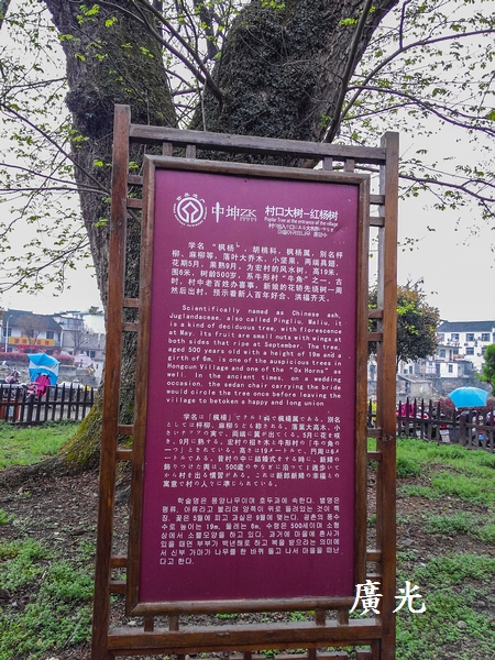 匆匆走過的『村口大樹』,分別為樟樹及銀杏樹,樹齡已有500多歲了,它代表牛形村的『牛角』,也是宏村的風水樹,聽說村中老人過世,壽棺都要繞樹三圈,表示『高福高壽,子孫滿堂』。