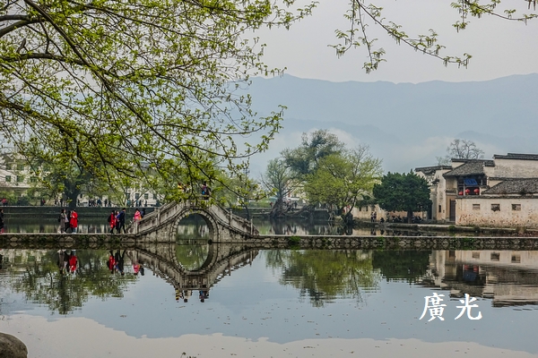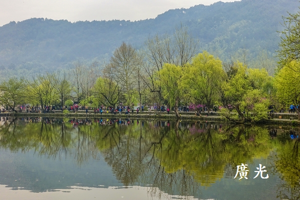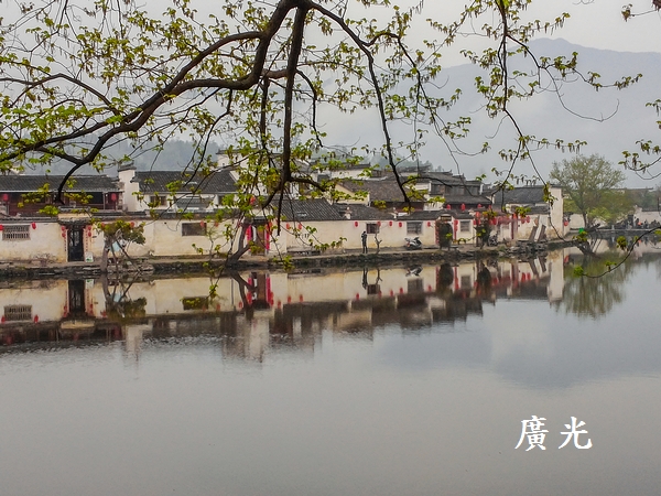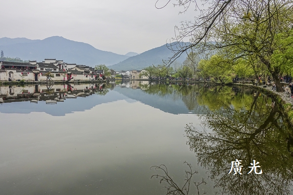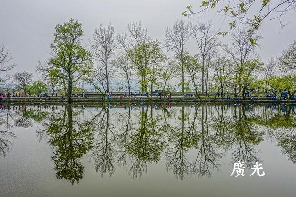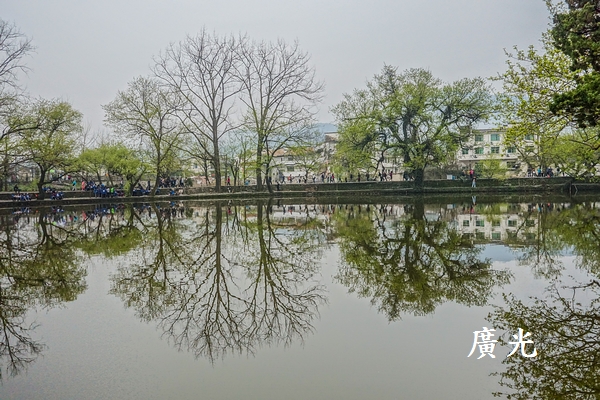 正因為天空是灰濛濛的,成了單調的背景,更加襯托出陸地上與水面倒影中剛長出新綠樹木的清新,我就這麼被眼前的「綠樹倒影」給吸引住了,貪婪的狂拍!心想:宏村怎麼會這麼有魅力呀!