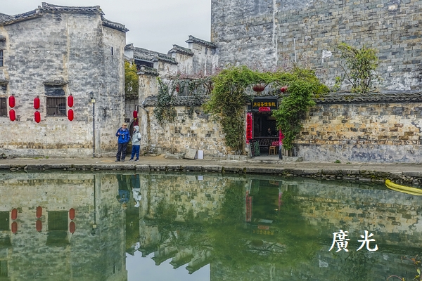 穿過村中蜿蜒的小巷來到村中心的『月沼』,村民稱為『月塘』或『牛小肚』,也就是俗稱的『牛胃』或『牛心』,它原是一處天然泉水,擴建於明永樂年間,村中上半部的水圳匯入此處,以供防火、飲用及洗滌等,過濾後再流入南湖。『月沼』經年碧綠,塘面如鏡,四週青石鋪展,圍繞粉牆青瓦,典型皖南民居,美得像幅畫,是李安「臥虎藏龍」重要取景場地。