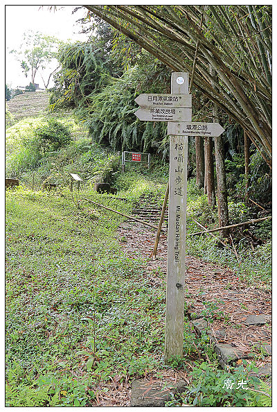 由登山口開始,沿途都有明顯的路程標示。這一條步道的前半段是通往茶葉改良場的道路,創立於日治昭和11年(西元1936年)的茶改場,歷經改制於民國88年7月改為行政院農委會茶葉改良場魚池分場,是台灣紅茶的發源地。
