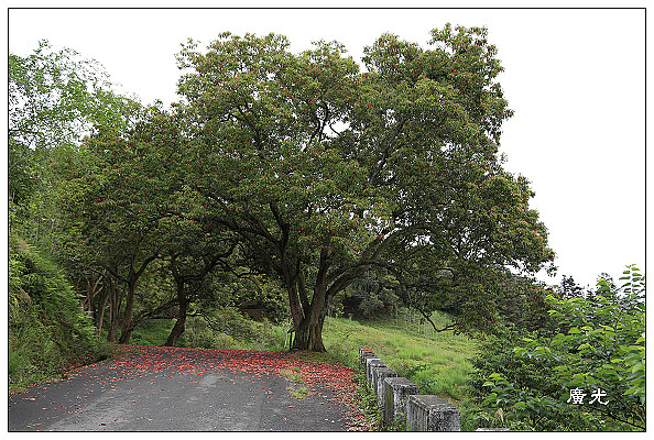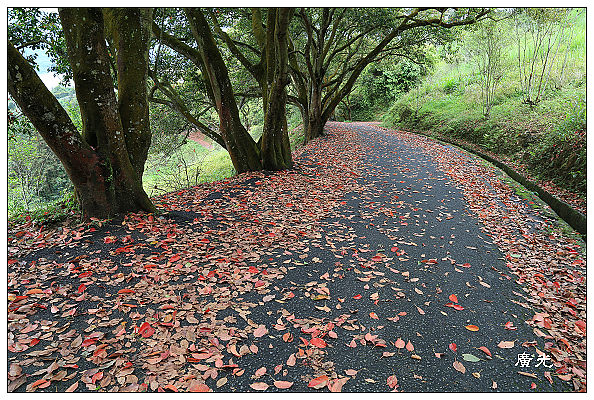 上稜線之後接回原來經過茶改場上貓囒山氣象站的公路,路旁有一整排高大的橄欖樹,紅色的落葉鋪滿了道路,形成獨特的景觀。