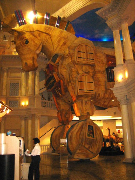 像是凱撒宮(Caesar Palace)的購物大道上就有一間大型的玩具店,入口處是一個巨大的木馬,以前每逢整點就會啟動機關,唱鬧一番,這一回去不知道是不是壞掉了,只能靜靜的不動,成了單純的擺設。