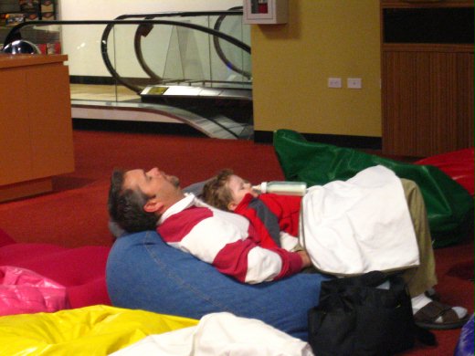 就像這一對父子,還真的是玩的累到趴了。雖然播放的電影劇情高潮迭起,仍然擋不住瞌睡蟲襲擊。