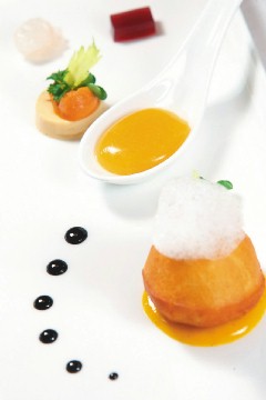 不過各家玩分子料理的手法都不相同,例如台中永豐棧麗緻飯店主廚鍾晴天透露,他把牛肉放入氮瓶中,取出再放入蒸烤箱中,以低溫蒸烤,肉汁與嫩度提高了一倍。麗緻旅館系統行政總主廚廖郁翔則是把分子罐頭處理過的百香果醬,製作成球狀置於調羹上,誤導人聯想到生鴨蛋,讓口感和視覺都具有樂趣。