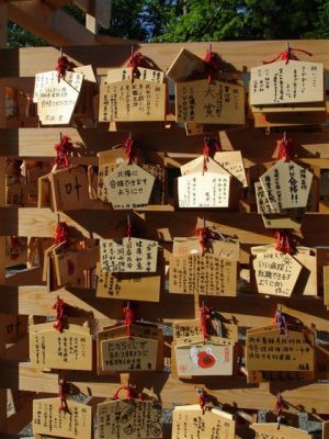 在籤箱旁邊還有一個架子,上面是繪馬,寫的都是願望。