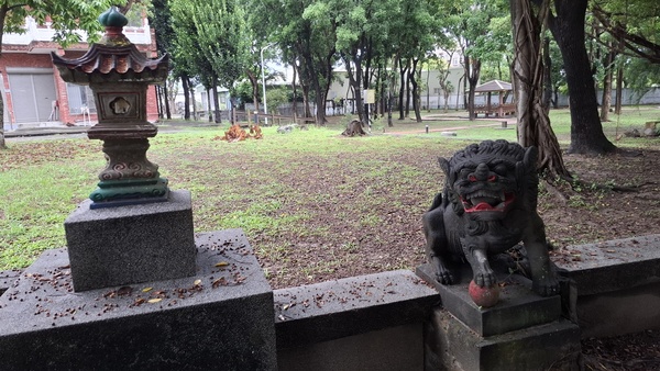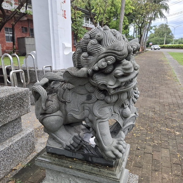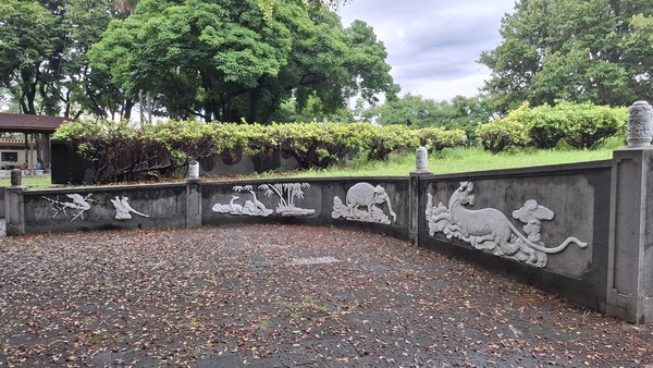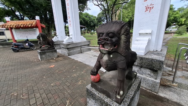 有三段曲手,柱頭為混凝土預鑄雲龍,高度愈往外而略低,曲手面分別塑有:水草、盆花、麒麟、虎豹獅象四獸。「松鶴長春」、「得祿」(竹、鹿)。