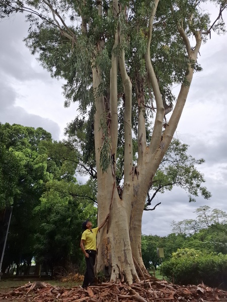 檸檬桉樹高度可達 25 公尺。樹幹筆直高聳,離地至相當高度才分枝,幹身老樹皮每年於春末夏初呈長條片狀剝落,呈現光滑的灰白色。