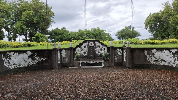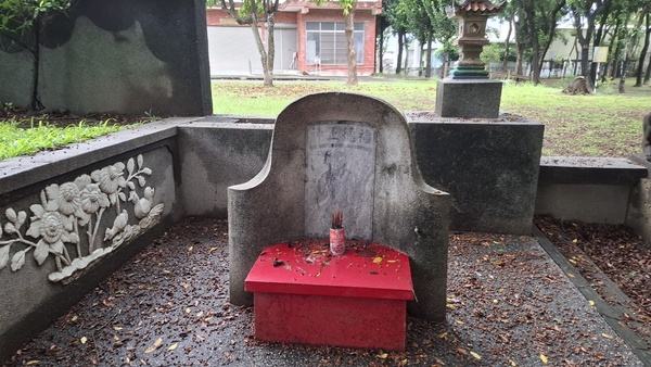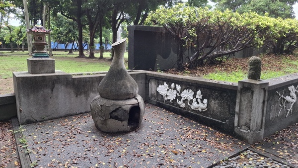 墓園右側的葫蘆形金爐。饅尾作「高貴功名」(白雞菊花)。