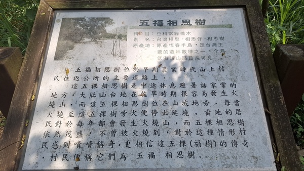 此地發生過火燒山數次,但這裡的相思樹卻皆能安然無恙,如此之福氣,被當地民眾取名為五福相思樹。
