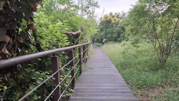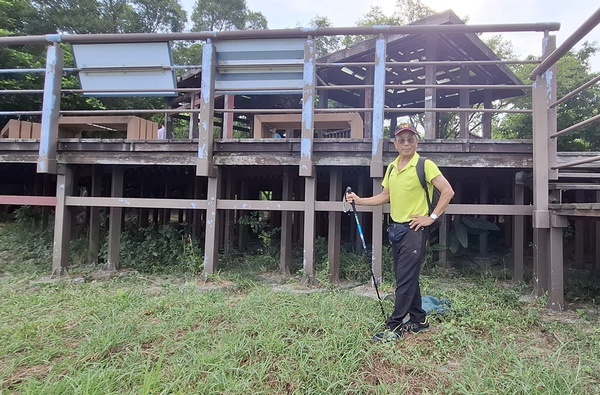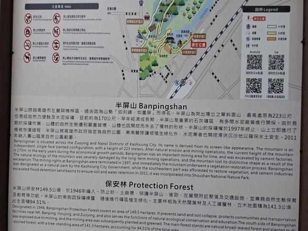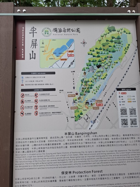 114.09.16早上我坐06:30自強號火車從台南出發,抵達新左營站是06:58,下車後07:12從車站直接出發往半屏山,07:21到達半屏湖木棧道登山口,登上平台後有左右兩條路線,左往半屏山,右往半屏湖,我取右,07:23看見日治時代建造的軍事碉堡,循著小徑走入半屏湖,前半湖有水,後半湖都是水生植物,雜木林中有小山徑,我判斷可能可通往半屏山,於是冒險向前走,路途荒涼,很多上坡階梯,07:57看見全程唯一的布條,信心大增,繼續在雜木林中前進,08:00接到往瞭望台的主步道,出口處是往暸望台還有0.5公里,很高興自已走了一條新路,直接從半屏湖走出來,08:12瞭望台,有相當良好的視野,南方可看到蓮池潭,春秋閣、龍虎塔、孔廟與左營舊城;而西邊可看見台灣海峽,以及造型特別的世運主場館,08:35樹蔭下大休息區,有涼亭、有桌椅,很多山友都在此地休息,08:38半屏山最高點,08:44指示牌,往北峰碉堡762公尺,19分鐘(實際上要30分鐘左右),08:55北峰展望點,北峰顯得相當突出,09:02通過大石壁,09:13碉堡洞口,09:33爬上北峰最高點(碉堡觀測台頂部),上面有一顆精密導線點,10:07從砲陣地走回程,10:29木製指示牌,10:30大休息區,10:37觀景台,10:38半屏山南峰,10:50距離步道口1.6公里,10:55涼亭展望處,11:14賞鳥亭,11:18步道入口,11:28新左營車站,總計費時4小時16分鐘。